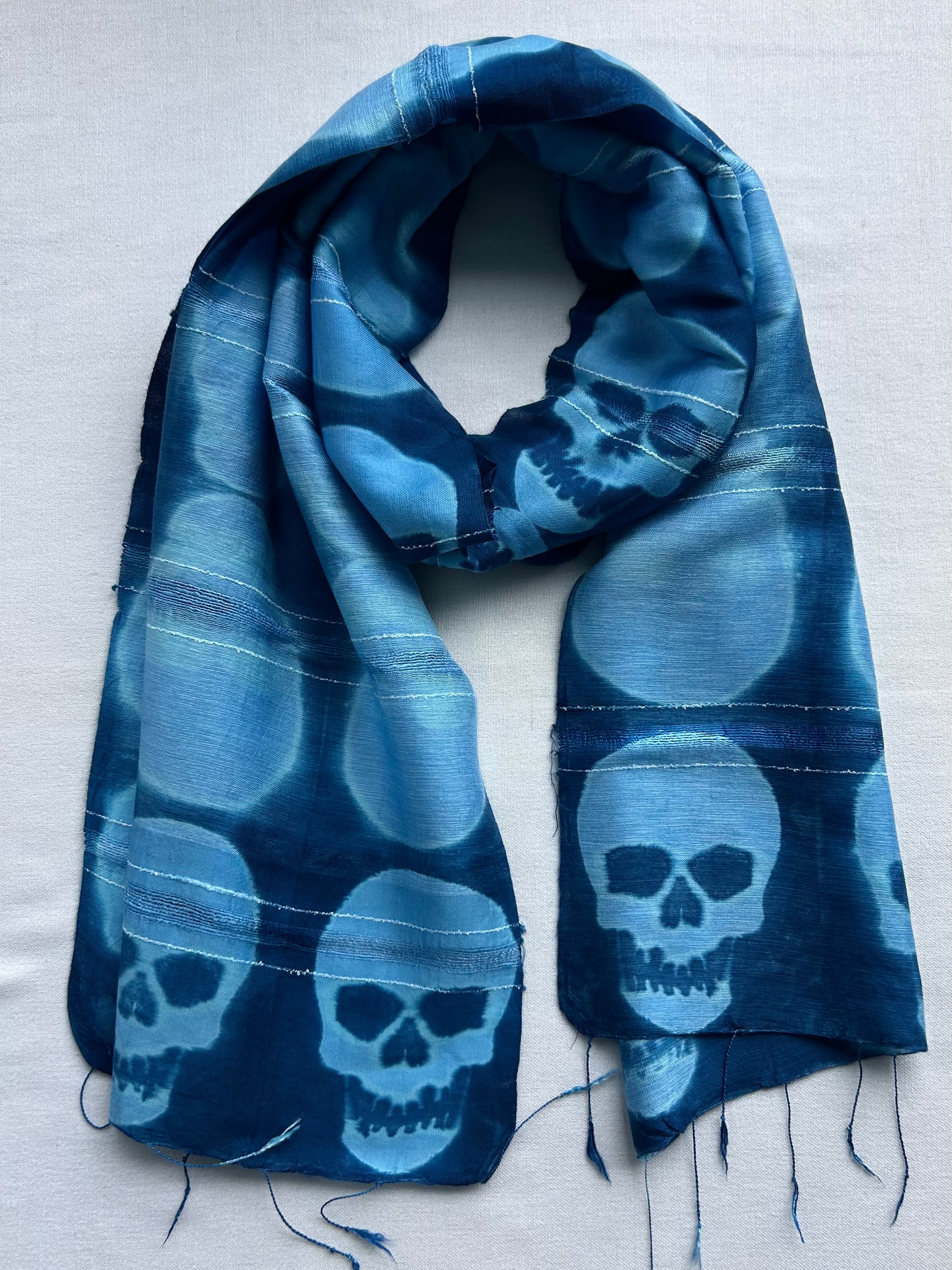 The cotton gives strength, the silk gives softness, and the two fibers react to the dye differently. An all-day, and almost all-season scarf.